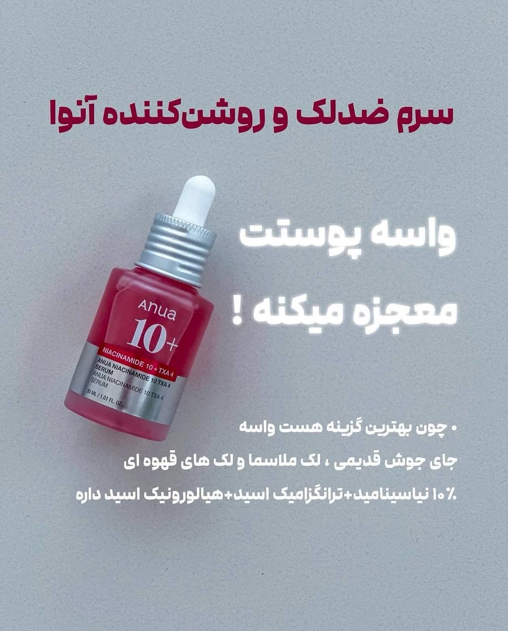 • ترانکزامیک اسید (TXA، چهار درصد): برای کاهش لکهای تیره، جای جوش و بهبود شفافیت پوست.